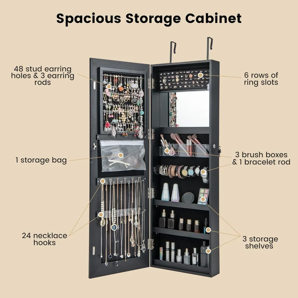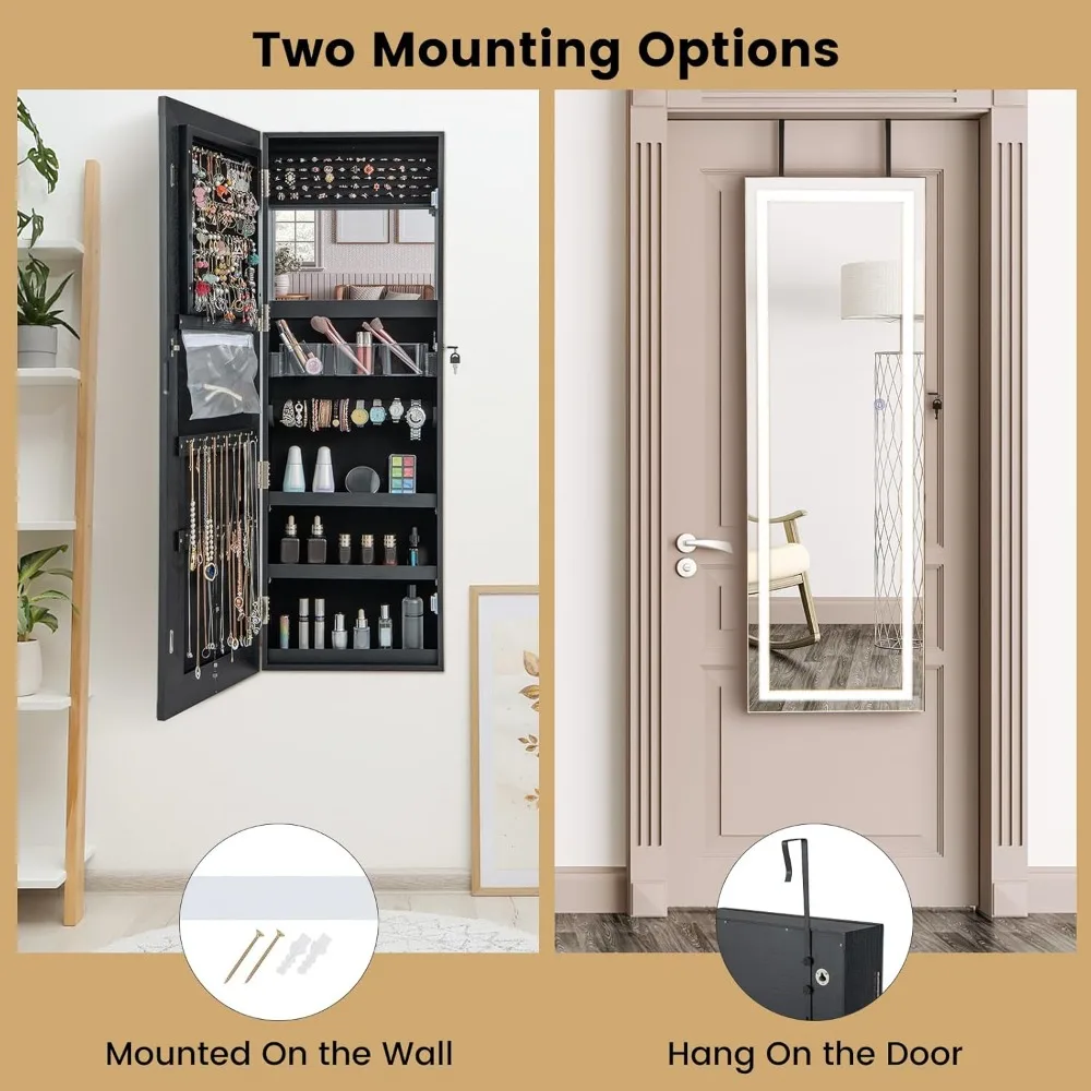 Inside, the spacious armoire features dedicated compartments for necklaces, earrings, rings, bracelets, cosmetics, and beauty tools. Everything stays neatly arranged and easy to find, eliminating clutter and protecting your valuables from tangling or damage. The cabinet can be wall mounted or hung over a door, offering flexible, space-saving installation options that fit any home.
