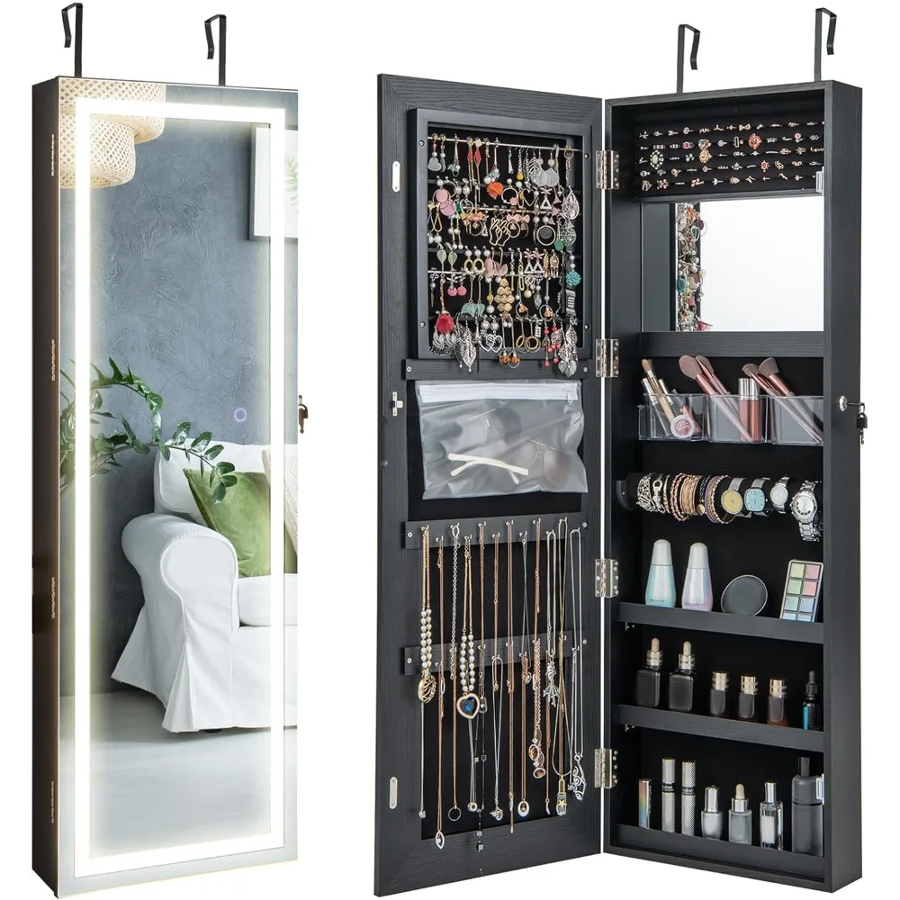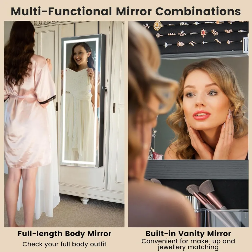 Designed with convenience in mind, the sturdy construction ensures long-term durability, while the secure closure keeps your items safe. The sleek, modern appearance makes it a stylish addition to bedrooms, dressing rooms, apartments, and walk-in closets. Perfect for anyone who values organization and aesthetics, the LED Mirror Jewelry Cabinet combines storage, lighting, and a full-length mirror into one elegant solution.